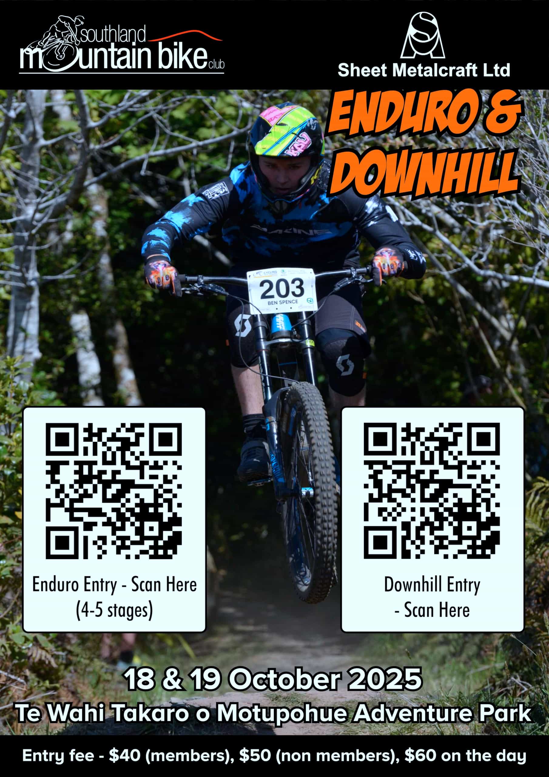 The 2025 Bluff Enduro will show-case the newly refurbished and fresh trails at the Motupōhue Adventure Park on Bluff Hill on the 18th October. There will be four stages, using a mix of grade 4 to 5 trails, with approximately 700m of climbing and descending. This is a non-shuttle assisted Enduro, where riders must ride up to reach the start of each stage to race down. Stages must be completed in order from stage one to four.